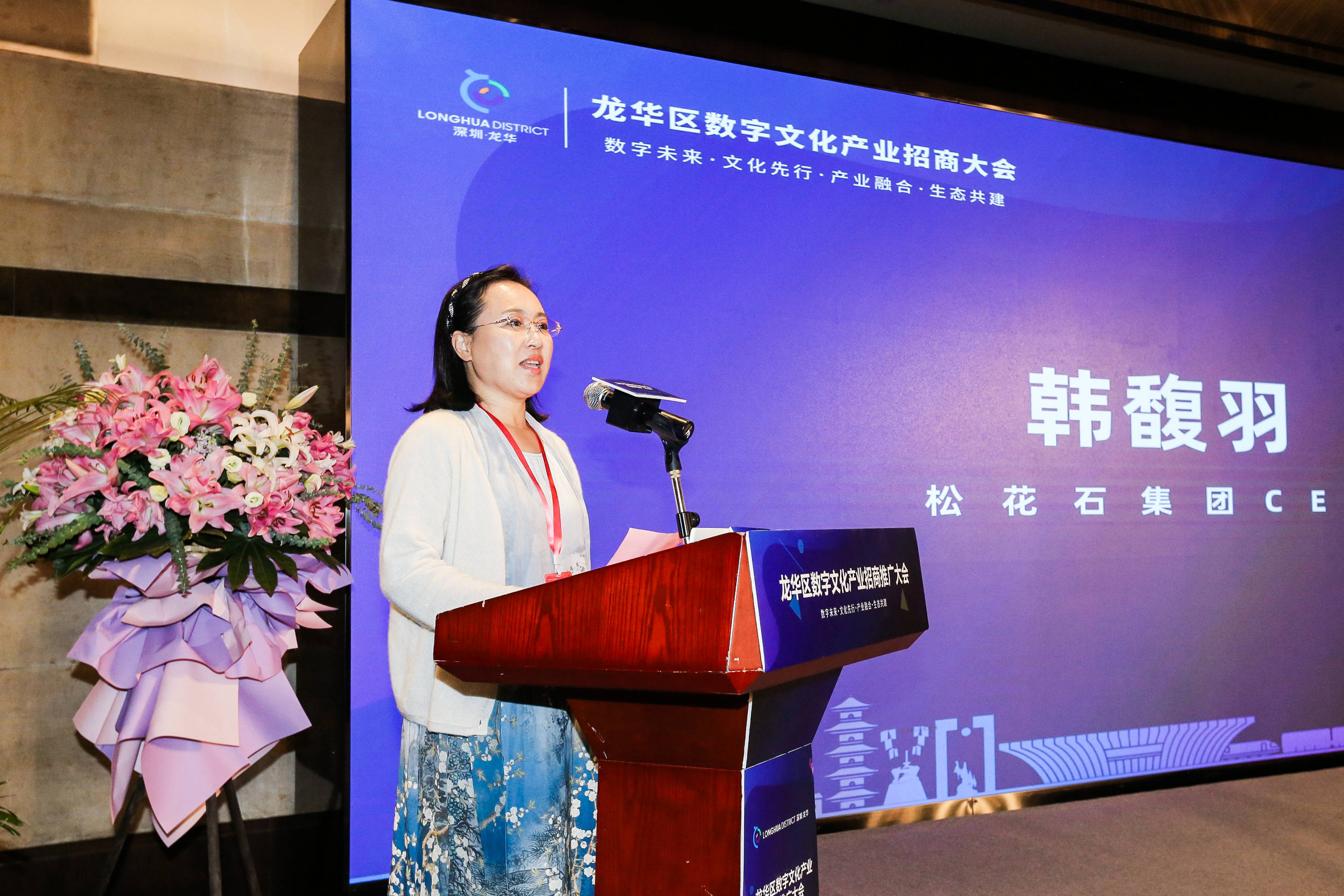 松花石集团CEO韩馥羽在致辞中表示,作为投融资代表,我们在龙华看到了投资的希望,看到了中小企业发展的机遇,我们将积极参与龙华区数字文化产业的投资、建设、发展,与在座的各位企业家一起扎根龙华,在龙华成长起来、发展起来。