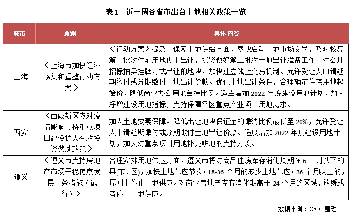 为了尽快从疫情中恢复,上海于5月29日出台了《上海市加快经济恢复和重整行动方案》。其中,在土地供应方面,《行动方案》提及,要尽快启动土地市场交易,优化土地出让条件,允许受让人申请延期缴付或分期缴付土地出让价款。值得一提的是,5月26日,上海土地市场网官宣2022年第一批次地块将重启出让,同时还调整了房企冻资金额,比例下调约两成,减轻房企拍地的资金压力。