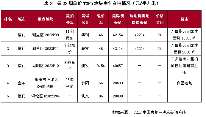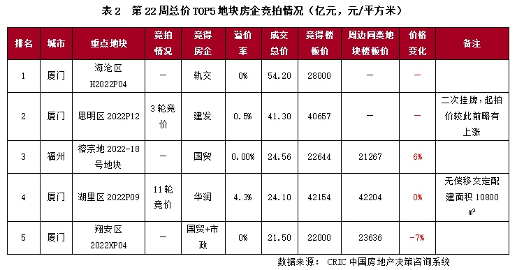 本周,厦门和福州均完成了年内第二批集中出让。在此影响下,入市优质高价地块明显增多,因此成交价格榜入榜门槛也较此前明显抬升。具体来看,本周成交总价最高的地块为厦门海沧区H2022P04号地块,成交总价为62.3亿元;门槛地块为翔安区2022XP04号地块,成交总价为24.7亿元。