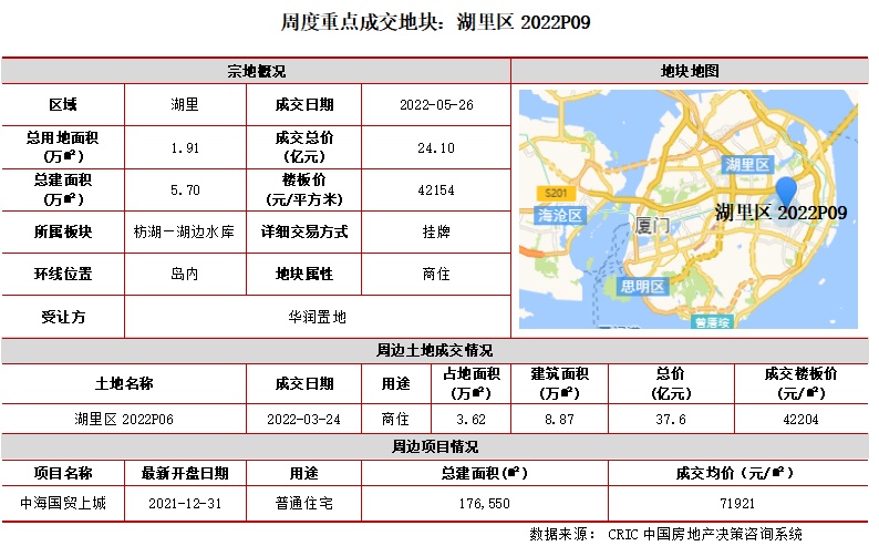 但分区域来看,岛内地块的竞拍热度整体仍高于岛外,3宗地块全部顺利出让,且均为溢价成交。其中,竞拍最激烈的当属湖里区P09古地石地块,共吸引了5家房企参拍,在经过11轮竞价后,由华润置地以24.1亿元的总价竞得,成交楼板价为42154元/平方米,溢价4.3%。和周边今年一批次成交地块相比,该宗地实际成交地价下降了约1000元/平方米,在项目销售限价相同的背景下,项目的利润空间进一步提升。不过,近两年来岛内土地供应量明显增加,项目周边有多个新房项目在售或待售,未来入市仍将面临一定的竞争压力。