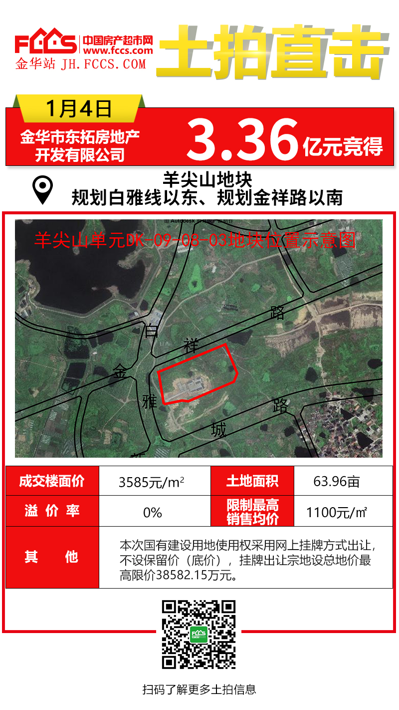 地块位于白雅线以东、规划金祥路以南,土地面积42637.11㎡,土地用途为居住/商业用地。规划容积率2.0-2.2,建筑密度≤22%,绿地率≥35%,建筑限高(住宅)≤30米。由东拓房地产开发有限公司以总价33632.15万元竞得,以**容积率2.2计算,成交楼面价3585元/㎡。
