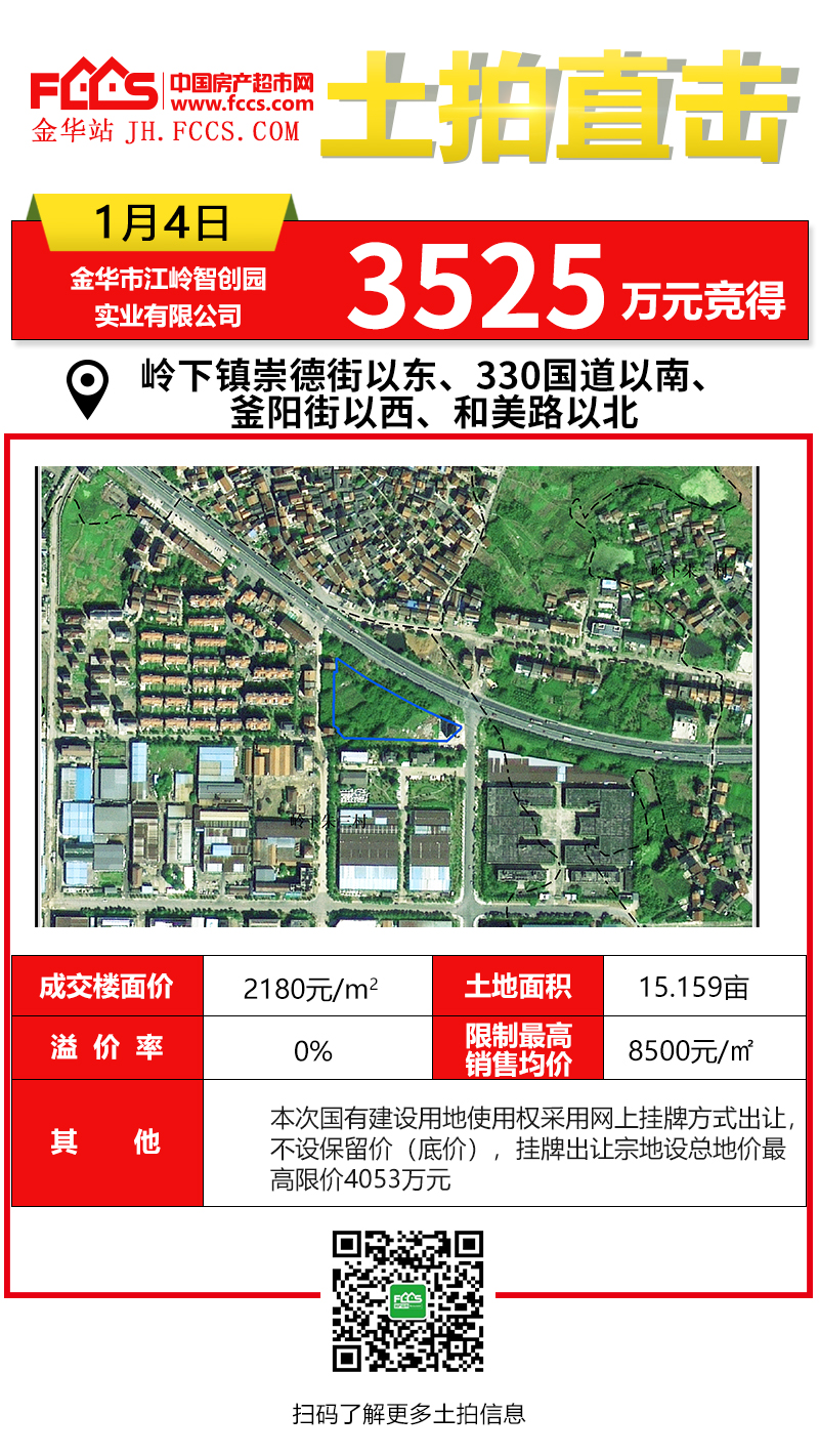 地块位于岭下镇崇德街以东、330 国道以南、釜阳街以西、和美路以北,土地面积10106㎡,土地用途为居住/商业用地。规划容积率1.4-1.6,建筑密度≤30%,绿地率≥15%,建筑限高27-36米。江岭智创园实业有限公司以总价3525万元竞得,以**容积率1.6计算,成交楼面价2180元/㎡。