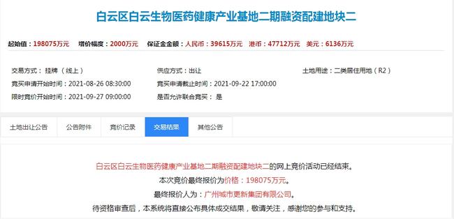 日前,白云生物医药健康产业基地二期融资配建地块二成功出让,由广州城市更新集团有限公司以198075万元竞得。